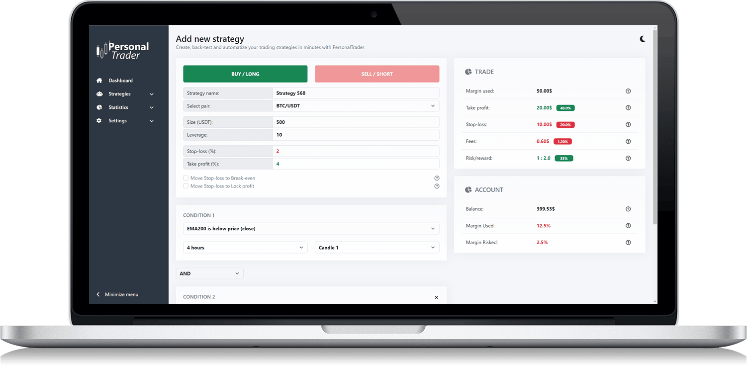 Create, back-test and automatize your crypto trading strategies in minutes.