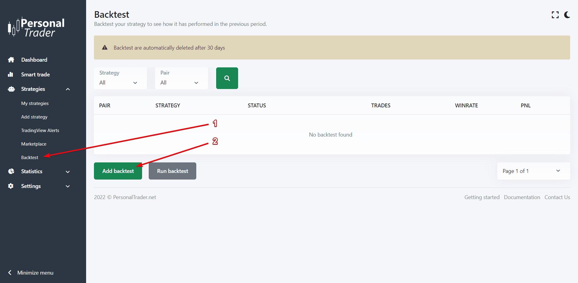 1. Log in to your PersonalTrader dashboard and navigate to: Strategies > Backtest.