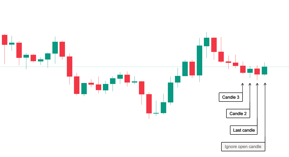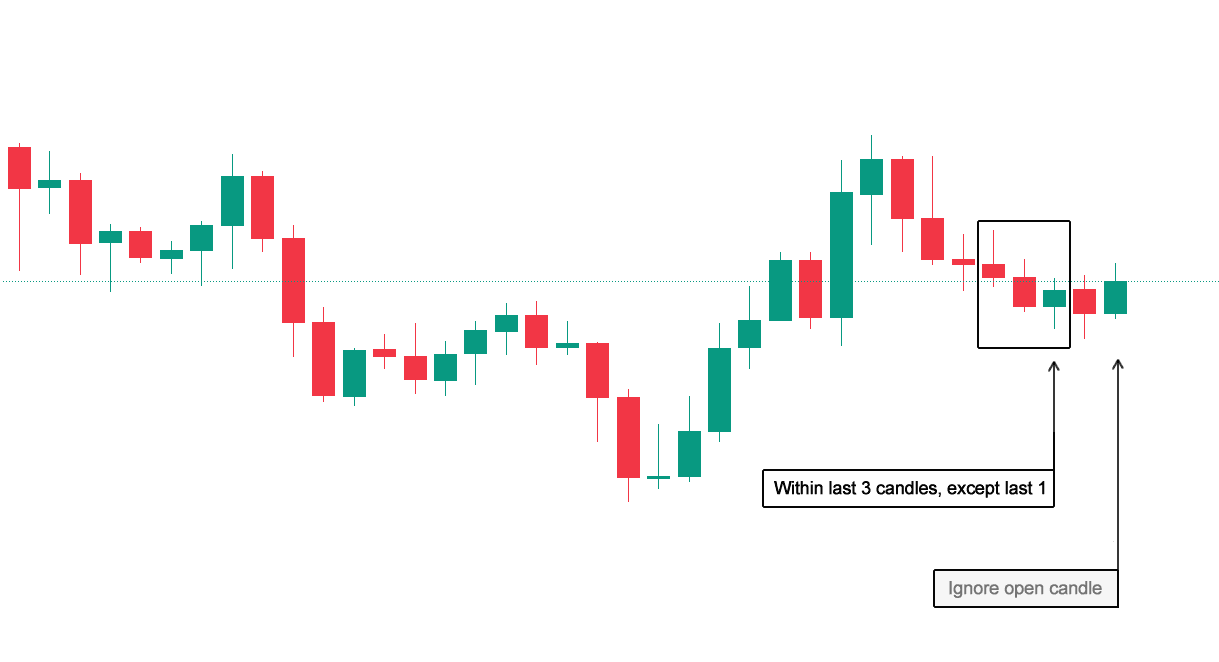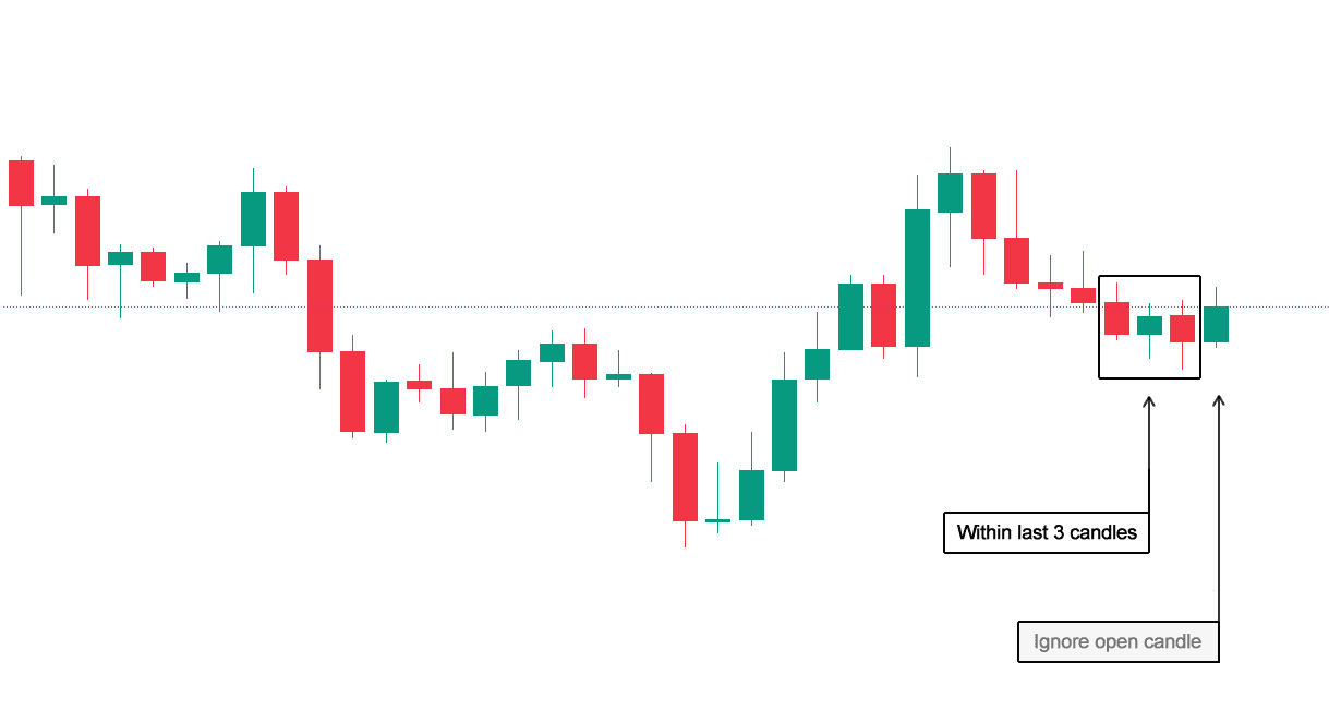 It triggers when the RSI crosses X up (where X is a number at your choice between 5 and 50). This condition considers 2 candles, the selected candle RSI should be above X and the previous candle RSI should be below X. If you select “within X candles”, this condition triggers if the RSI crosses X up at least once within the selected candles.