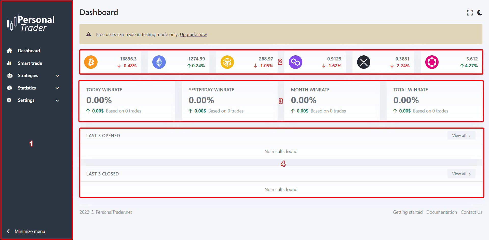 Right below you can see the statistics of all your trades and strategies. There are 4 sections that contains the statistics of: today, yesterday, current month and total (from the beginning). In each section you will see your win-rate, PnL (profit and loss) and the number of trades made in that period.