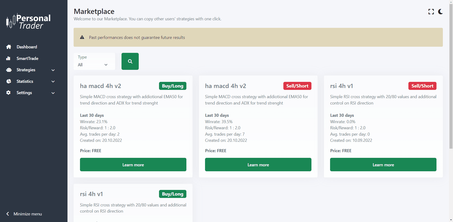 2. Search the trading strategy you would like to copy and click the “learn more” button. For each trading strategy you can see a description, the creation date, and plenty of statistics to understand how it has performed in the past.