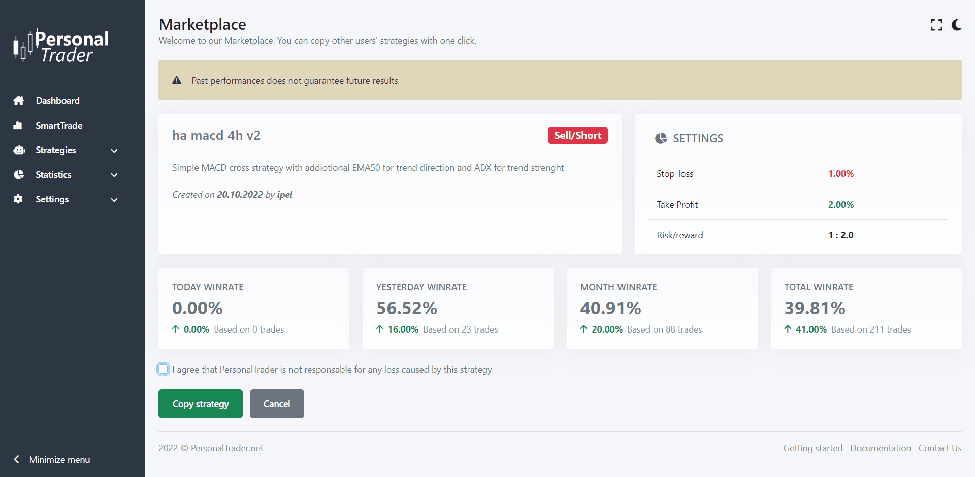 Past performance does not guarantee future results. Trade at your own risk. We are not responsable for any loss that might occur when trading with PersonalTrader.